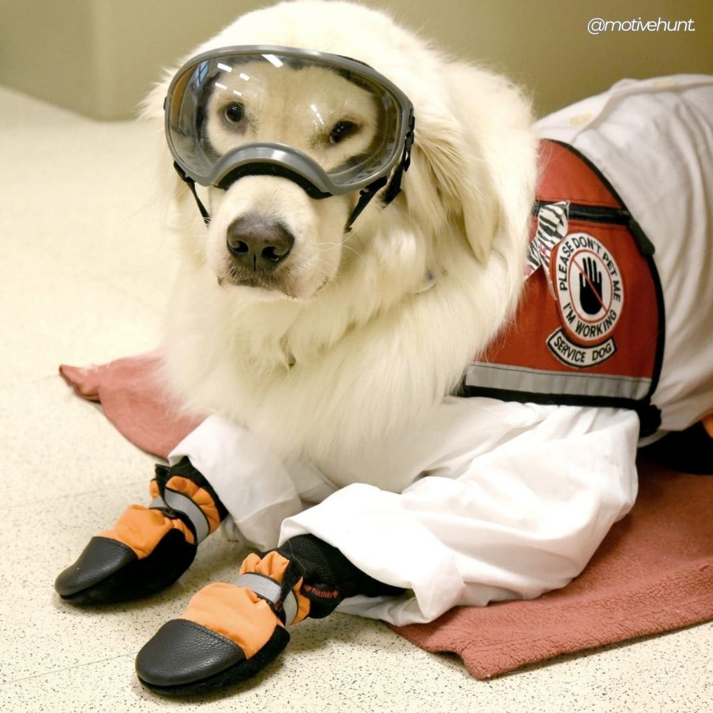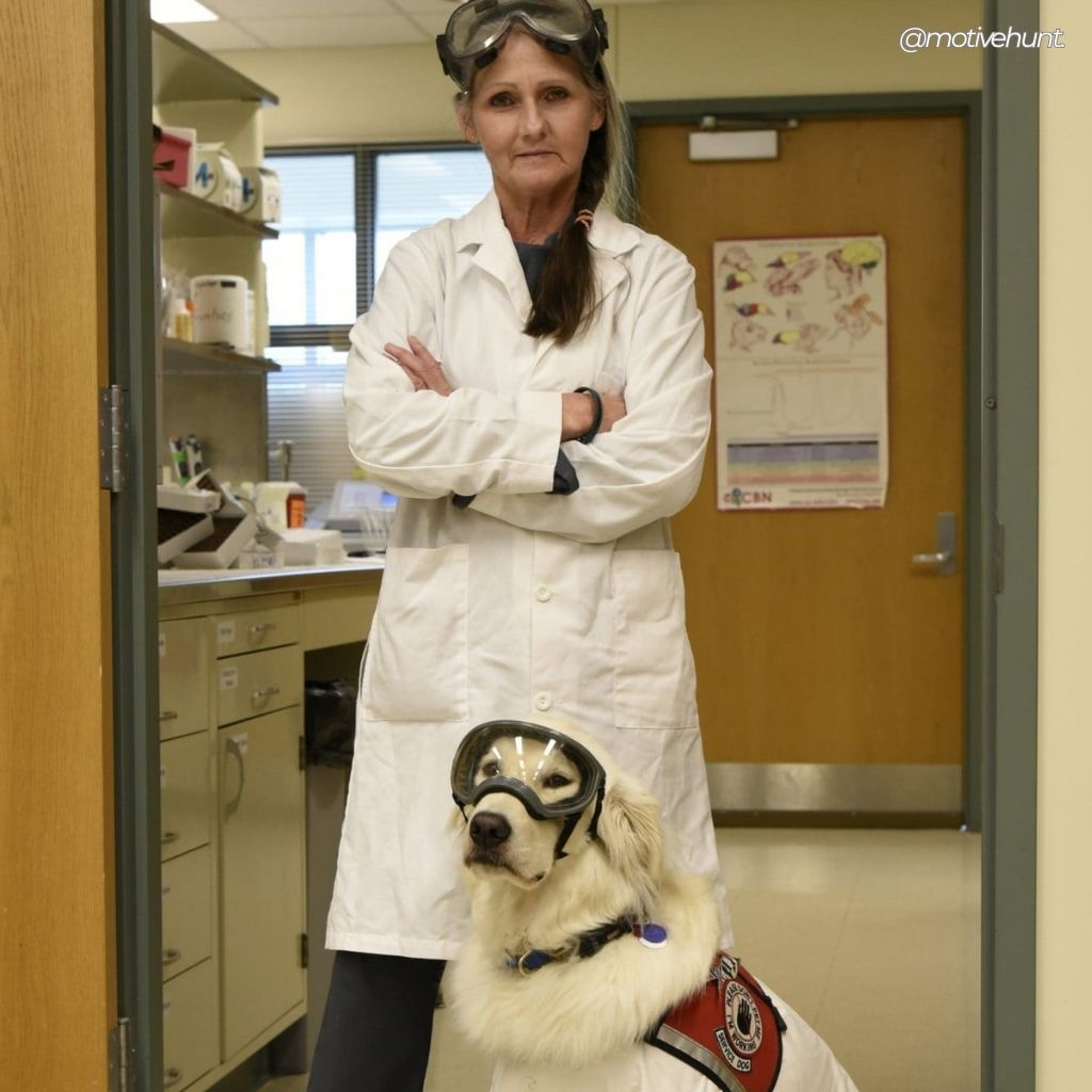 In labs where breakthroughs happen every day, one golden retriever in PPE stands as a quiet reminder that science and compassion can walk side by side.