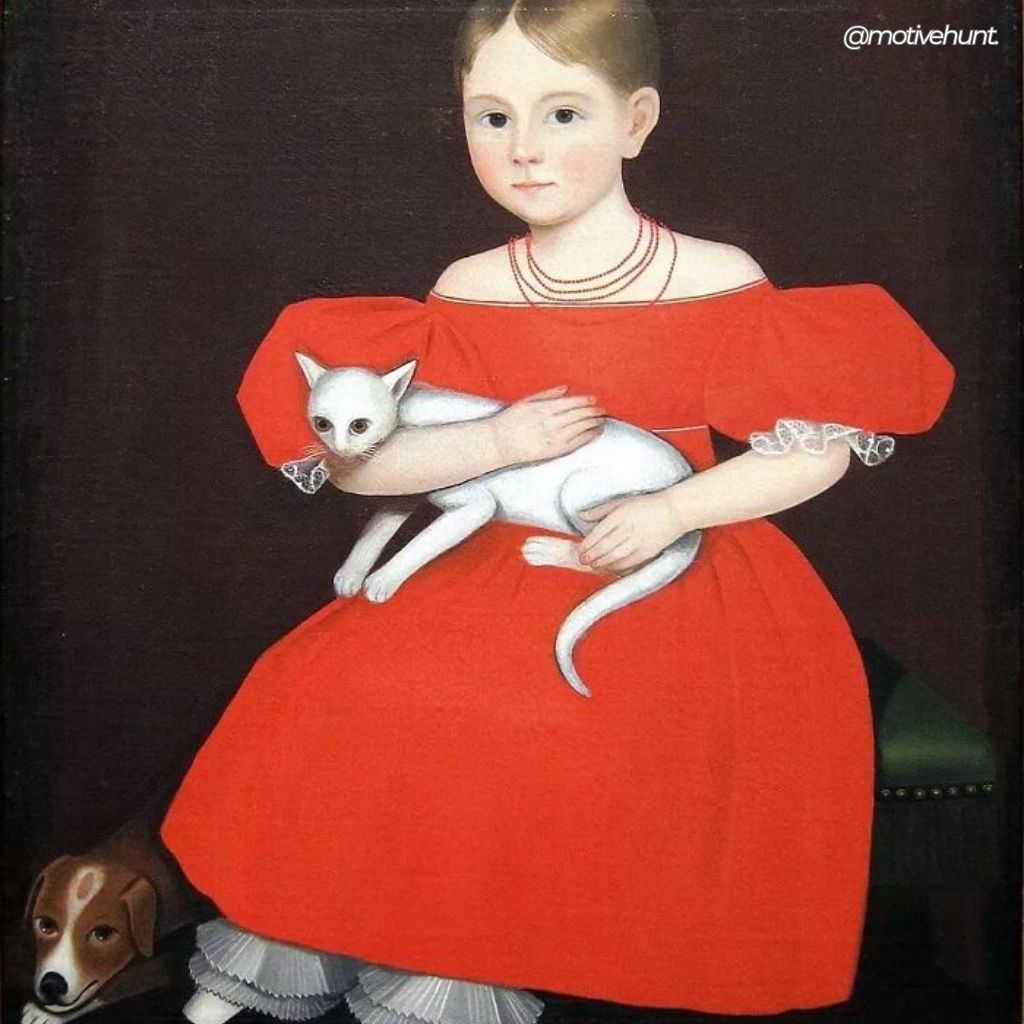28. “Girl in Red Dress with Cat and Dog” by Ammi Phillips, 1830, USA